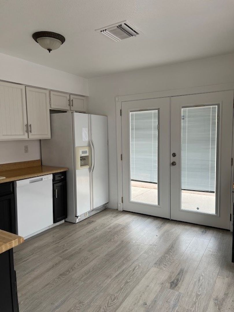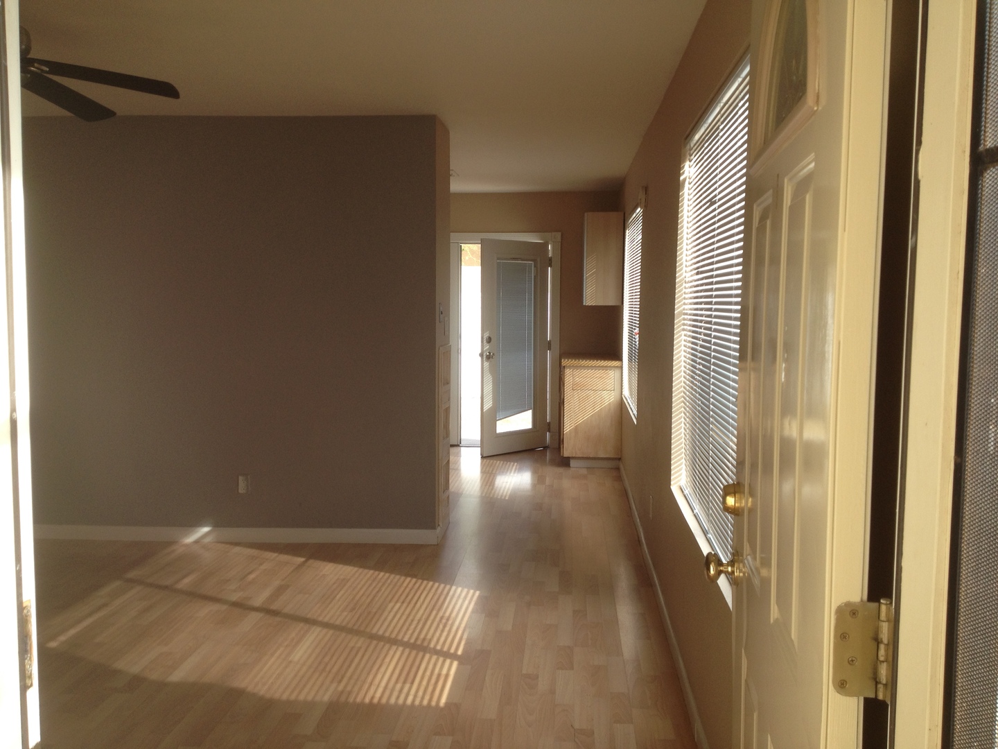 Kitchen with French Doors leading to back yard. Very nice and pleasant front patio area. 3 bedrooms, 2 bath, large master bedroom. One car garage with carport area. Vinyl flooring updated. Ceiling fans in bedrooms and living room. Washer / Dryer, Dishwasher, Refrigerator, Stove/Range. Backyard is spacious and landscaped.